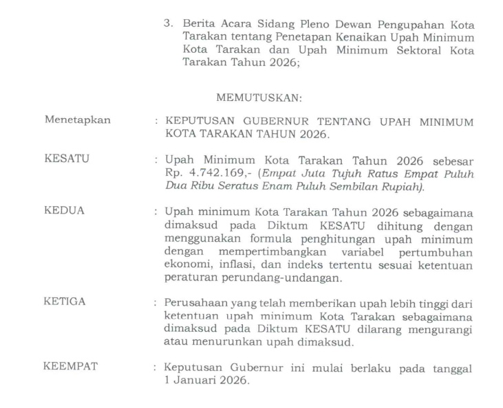 TARAKAN – Pemerintah resmi menetapkan Upah Minimum Kota (UMK) Tarakan Tahun 2026 melalui Surat Edaran Nomor 100.3.3.1/708/2025 tentang Penetapan Upah Minimum Kota Tarakan. Kebijakan ini menjadi dasar hukum pengupahan bagi perusahaan dan pekerja di wilayah Kota Tarakan dan mulai berlaku efektif pada 1 Januari 2026.